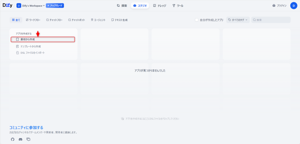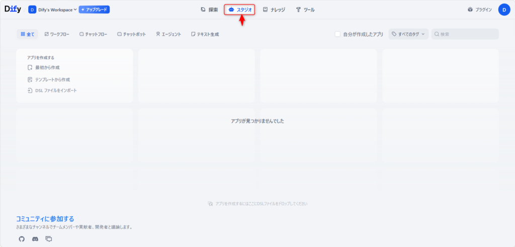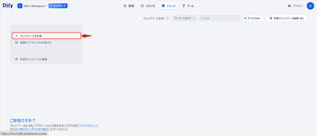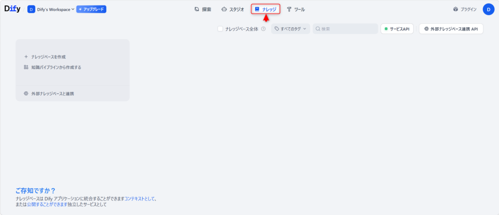 Difyにログインし、画面上部のメニューから「ナレッジ」をクリックします。