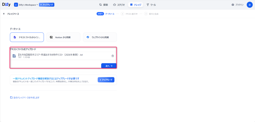 「テキストファイルから」を選び、自社の物件情報や過去の優秀な提案書のファイル(PDFやWordなど)をアップロードします。(例:福岡市_おすすめ物件リスト.pdf)