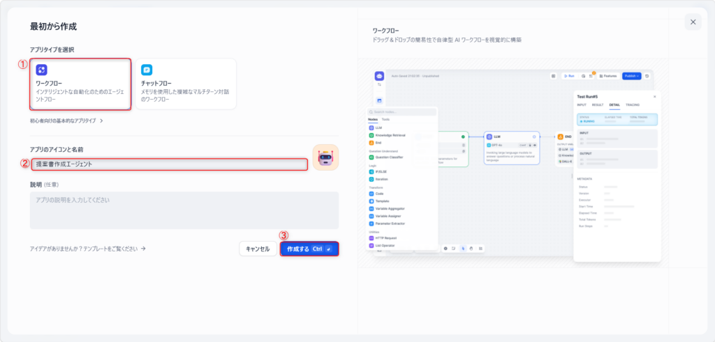 画面上部の「スタジオ(またはアプリ)」に戻り、「最初から作成」「ワークフロー」を選択し、名前に「提案書作成エージェント」と入力して作成ボタンを押します。