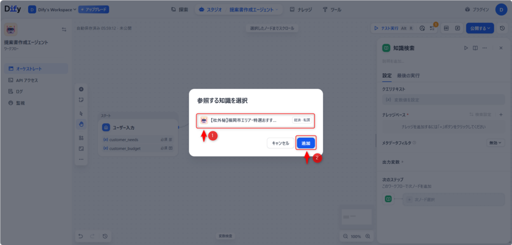 Step 2: 「知識検索(Knowledge Retrieval)」ノードの追加 ─ 資料を探させる
