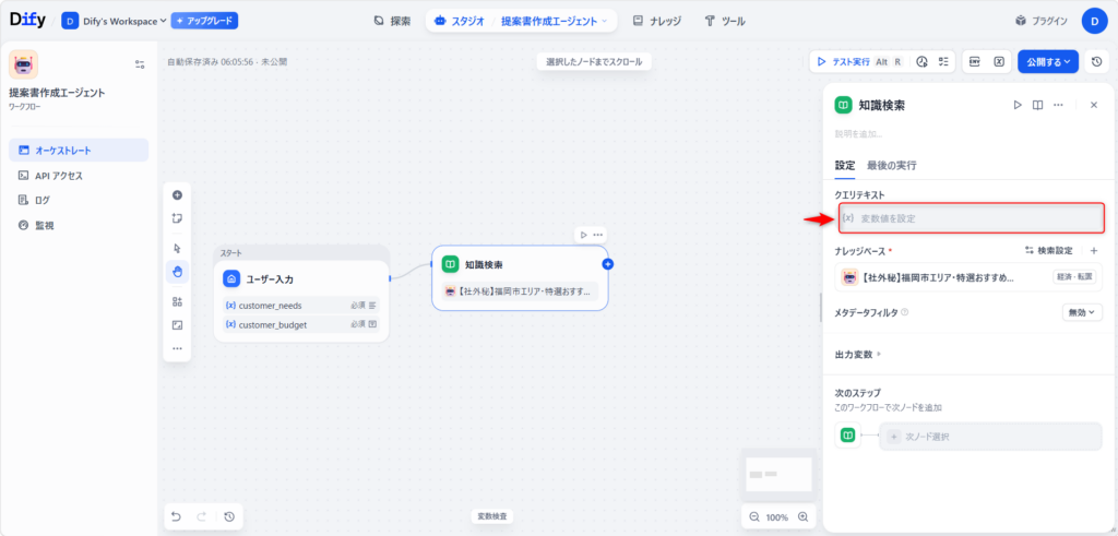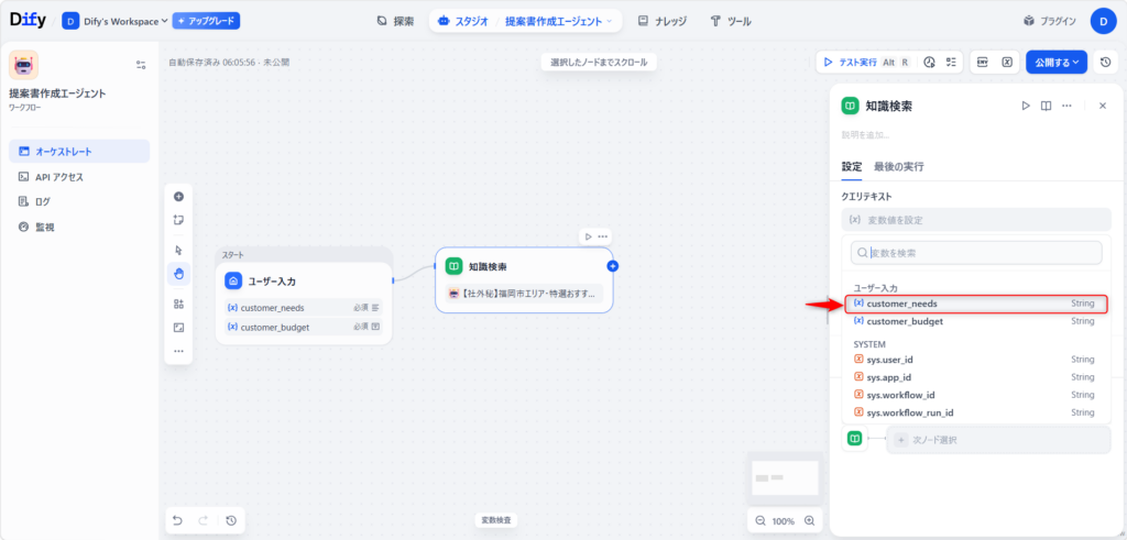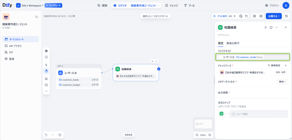 💡 この設定の意味 これにより、AIに対して「Step 1の受付窓口(ユーザー入力)に入力されたお客様の要望(customer_needs)と同じキーワードを、指定した自社資料(ナレッジ)の中から探し出せ」という厳格な命令が完成します。