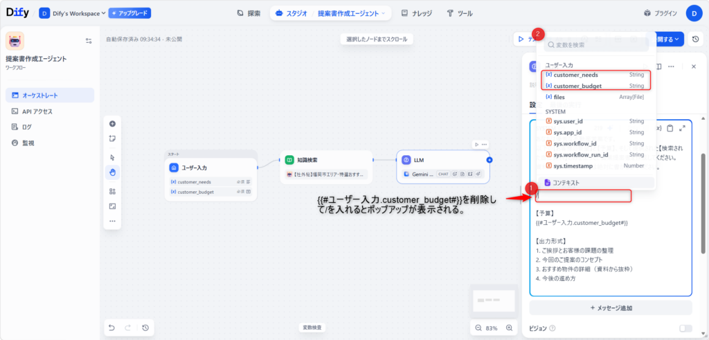 • 下の {{#ユーザー入力.customer_budget#}}も同じ手順で消し、 「customer_budget」 の青いブロックに変換する。