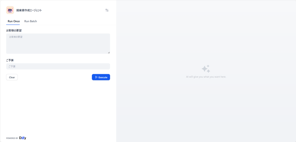 💡 明日からの使い方 次回からは、Difyの難しい設定画面を開く必要は一切ありません。「お気に入り」からこの専用ページを開き、お客様の「要望」と「予算」を打ち込んで実行ボタンを押すだけです。