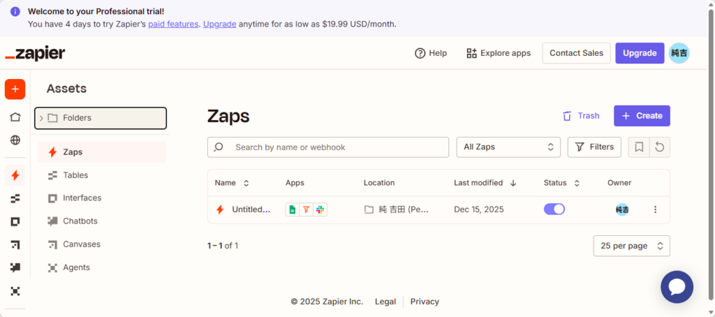 - 登録が完了したら、Zapierのダッシュボード(メイン画面)が開きます。