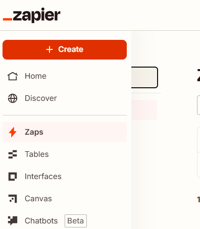 1.画面左上にある「+Create」というオレンジのボタンをクリックし、「Zaps」をクリック。