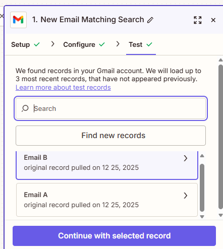 4.「Test trigger」をクリック → 「Continue with selected record」をクリック。