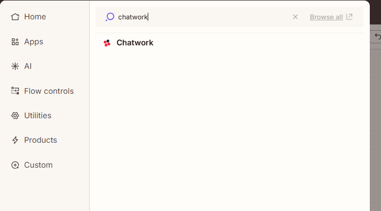 1. 画面下の「+」ボタンをクリック(新しいアクションを追加)し「Chatwork」を選択。