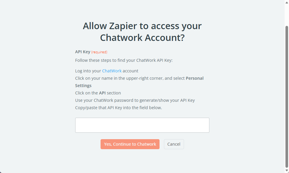3-3. Zapierに戻って、そのトークンを貼り付けて「Yes, Continue to Chatworkをクリック。