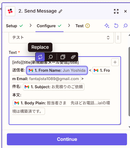 5. Text:ここに通知の内容を書く(Gmailのデータを自動挿入可能)。