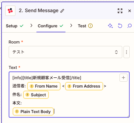 7. 「Test step」をクリック → Chatworkの指定ルームにテストメッセージが届いたら成功!