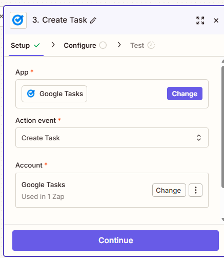 3. 「Action Event」で「Create Task」(タスクを作成)を選択 → 「Continue」。