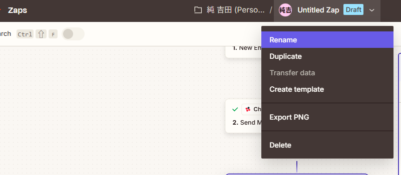 - 画面左上の無題の部分をクリックして、名前を変更(例: 「顧客メール → Chatwork共有 + Tasks追加」)。