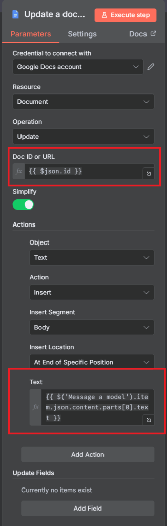 4-3. Update a documentをクリックし設定を確認する。作成したGooldeドキュメントのIDを指定し、Message a modelの出力結果をテキストとし記載してUpdateする。