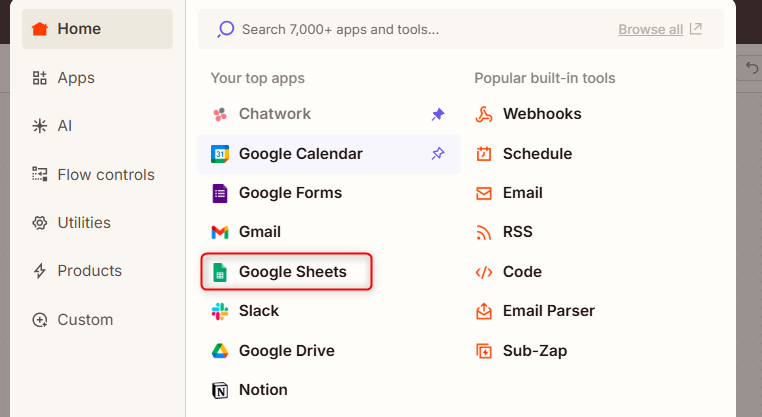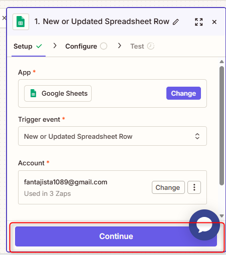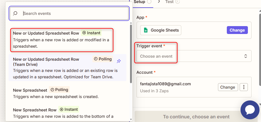 3.「Trigger Event」ドロップダウン → New or Updated Spreadsheet Row を選択