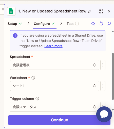 Trigger Column「商談ステータス」(D列)を選択 ← ここを間違えると動かない!