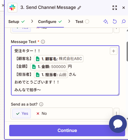Channel投稿したいチャンネル(例:#sales-celebration)をドロップダウンで選択