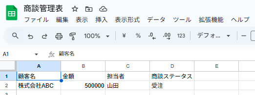 1. スプレッドシートのD2セル(商談ステータス)を「進行中」→「受注」に変更