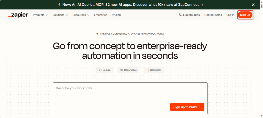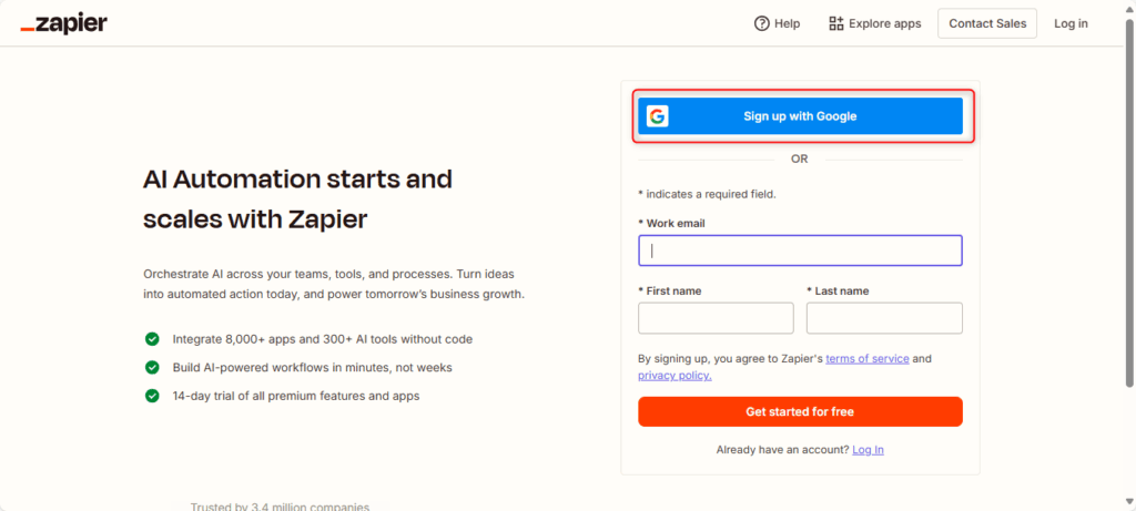 ブラウザ(例: Google Chrome)で zapier.com を開きます。画面上部の「Sign up」ボタンをクリックします。