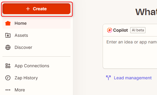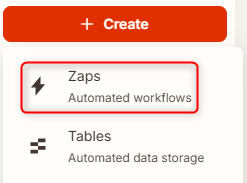 ダッシュボード(白い画面)が開いたら、左側のメニューから「Create」をクリックし、「Zaps」ボタンをクリックして、Zapエディタ(作業画面)を開きます。