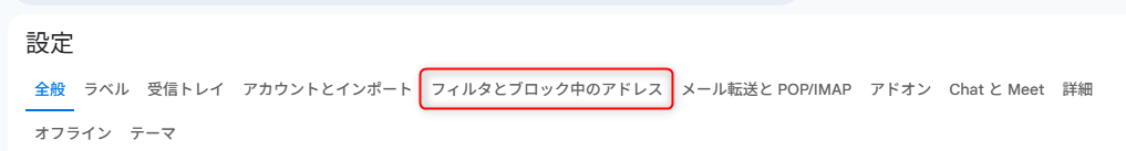 上部タブから「フィルタとブロック中のアドレス」をクリックします。