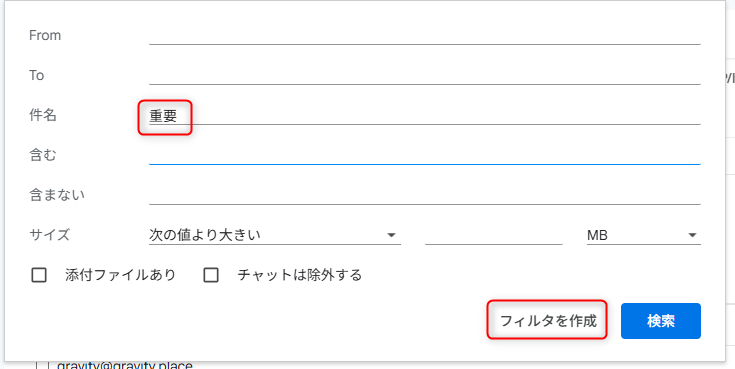 ポップアップで「件名」に「重要」と入力(例: クライアントの重要メールを指定)、または「送信者」にメールアドレス(例: client@company.com)を入力します。