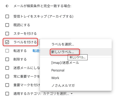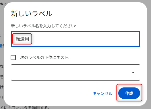 「フィルタを作成」をクリック → 「ラベルを付ける」をチェック → 「新しいラベルを作成」を選び、名前「転送用」と入力 → 「作成」をクリック。