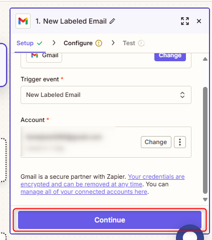 「Account」セクションで、接続済みのGmailアカウントが表示されるので選択(未接続なら「Connect a new account」→Google承認ポップアップで「許可」)。