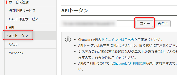 「APIトークン」をクリックし、APIトークンをコピーしてメモ帳に貼り付けておく。