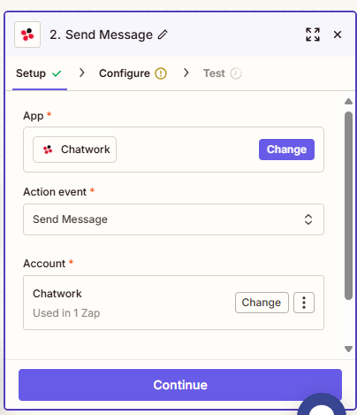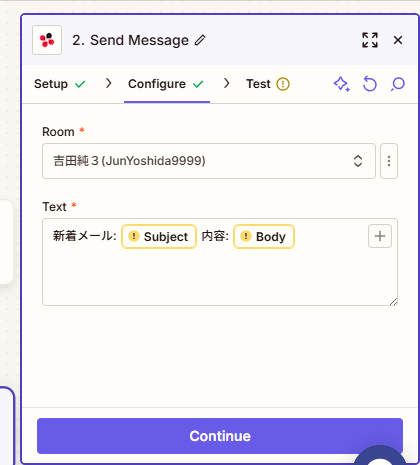 ・「Room」欄に、ChatworkのグループIDを入力(例: グループURLの「cw_id_123」部分、またはZapierの「Search Rooms」から選択)。