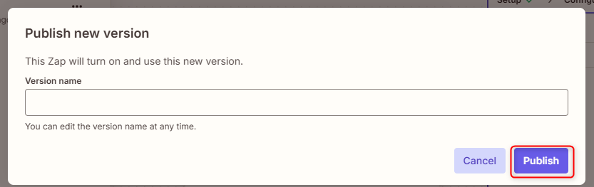 ポップアップで「Publish」ボタンをクリック → 「Name new version」欄にバージョン名を入力 → 「Publish」ボタンをクリック。