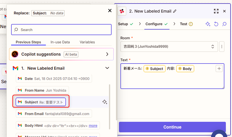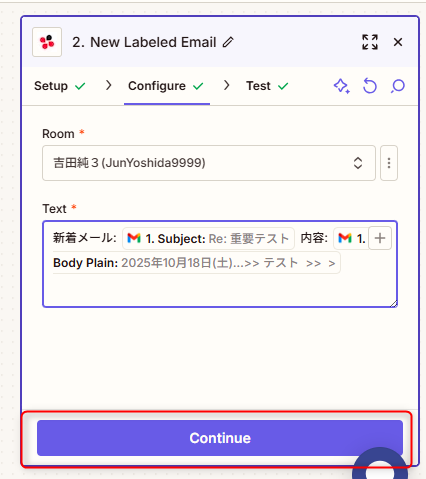 画面下部の「Test Trigger」ボタン(青色)をクリック → 1分待つ(テストメール「重要テスト」を受信)→緑の「Success」メッセージとメールデータ(例: 件名/本文/送信者)が出たら、「Continue」をクリック。 ヒント: テストデータが出ない場合、Gmailで新メールを1通受信してから再試行。
